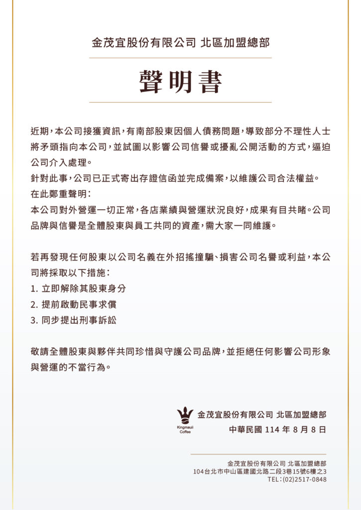 針對此事,公司已正式寄出存證信函並完成備案,以維護公司合法權益。